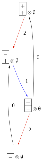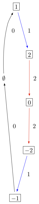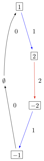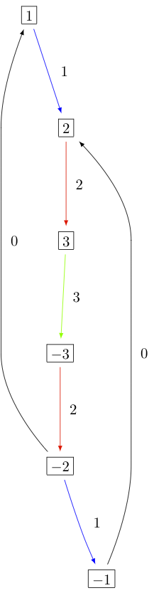 As you can see, both \(b=1\) and \(b=-2\) satisfy \(\varphi(b)=\Lambda_1\). Hence there is no bijection between the minimal elements in \(B_{\mathrm{min}}\) and level 1 weights. Therefore, \(B^{1,1}\) of type \(C_3^{(1)}\) is not perfect. However, \(B^{1,2}\) of type \(C_n^{(1)}\) is a perfect crystal: