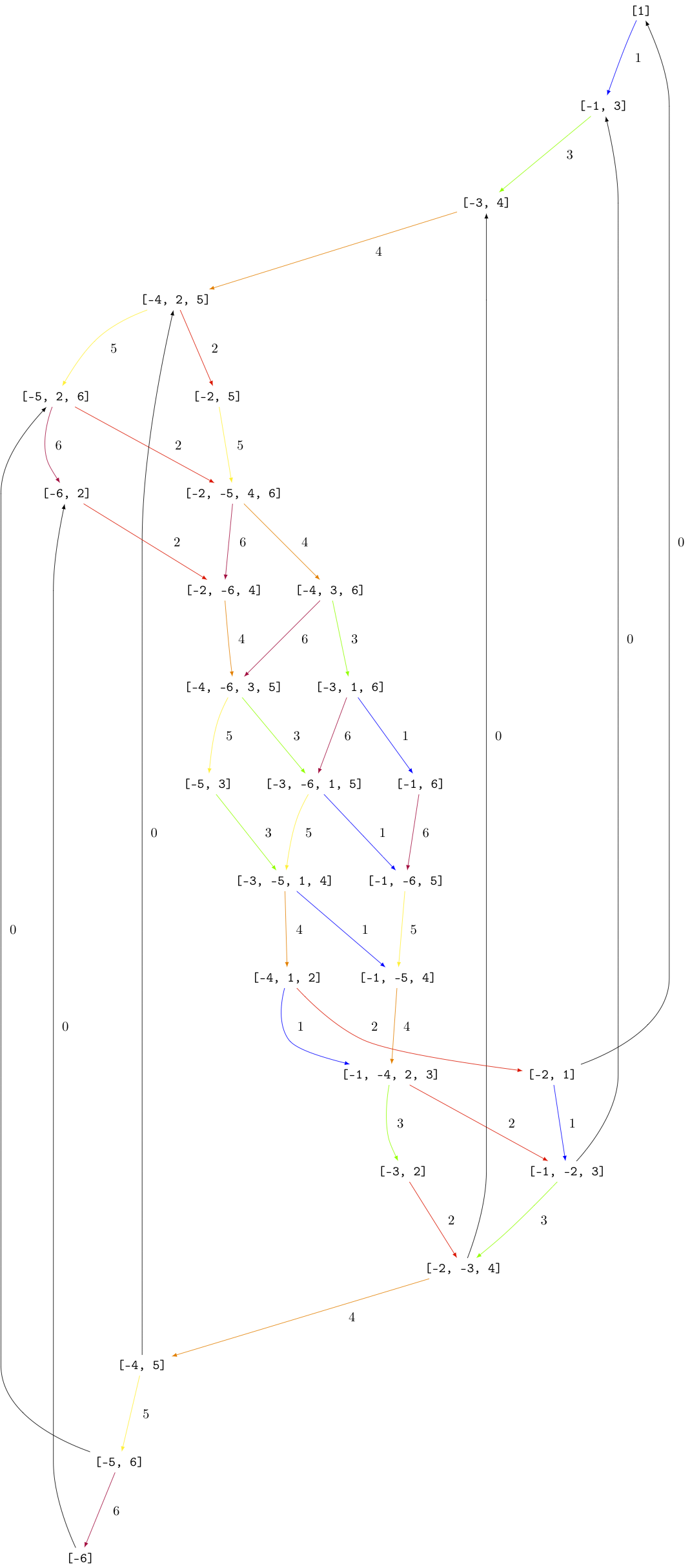 The crystal \(B^{1,1}\) is already of dimension 27. The elements \(b\) of this crystal are labelled by tuples which specify their nonzero \(\phi_i(b)\) and \(\epsilon_i(b)\). For example, \([-6,2]\) indicates that \(\phi_2([-6,2]) = \epsilon_6([-6,2]) = 1\) and all others are equal to zero: